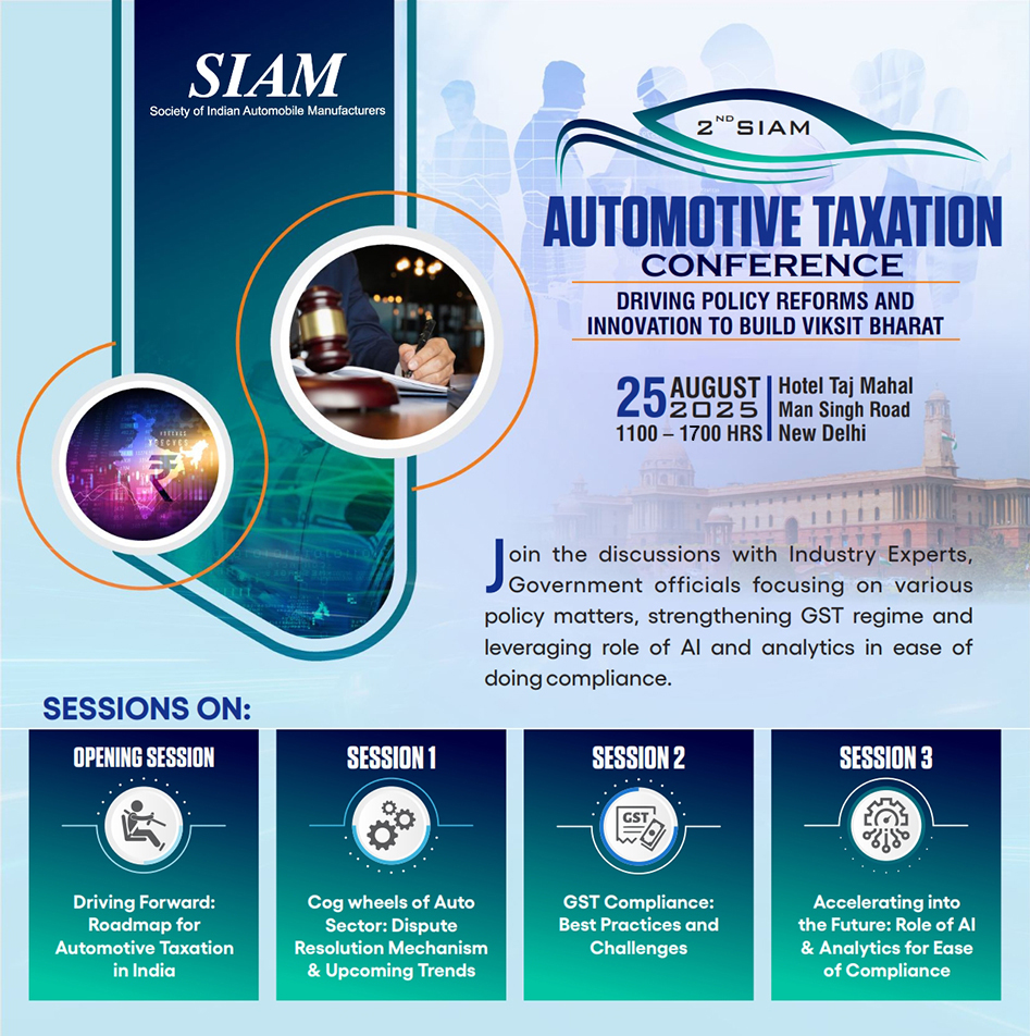 In order to keep continuing this dialogue with the Government and related stakeholders, SIAM is organising the 2 nd edition of SIAM Automotive Taxation Conference. Join the discussions with Industry Experts, Government officials and Automotive Tax Experts, focusing on various policy matters, strengthening GST regime and leveraging role of AI and analytics in ease of doing compliance