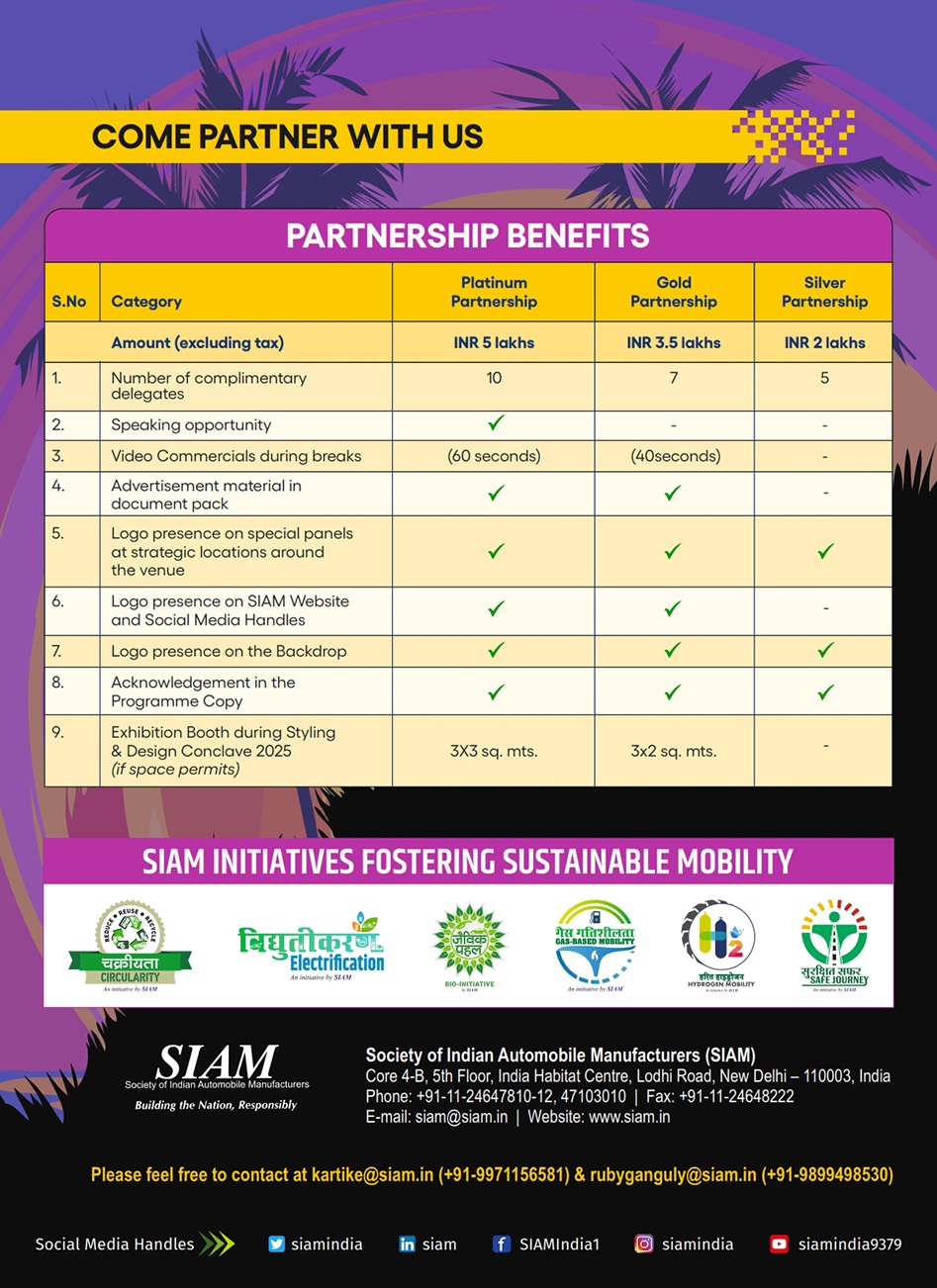 SIAM proudly announces the landmark 20th edition of its Styling & Design Conclave, to be held in Goa, alongside the 18th Automotive Design Challenge (ADC). This platform brings together leading designers, industry experts, and young innovators to explore the future of automotive styling, creativity, and design excellence.