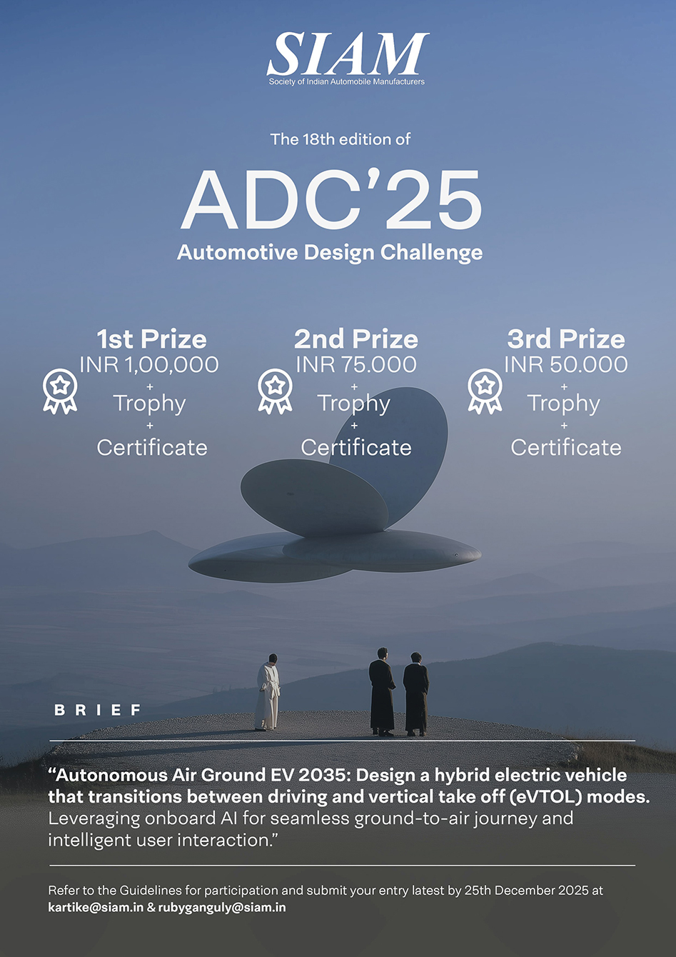 SIAM is delighted to announce the 18th edition of the Annual Design Competition – Automotive Design Challenge (ADC). The competition invites budding designers from across India to showcase their creativity, vision, and problem-solving skills for the future of mobility.
